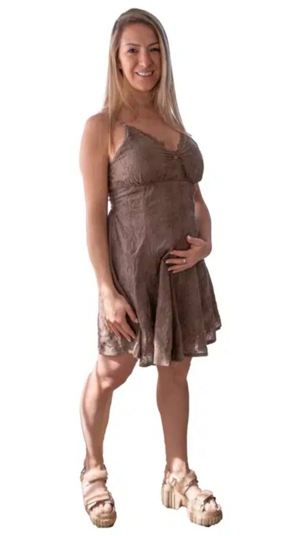 Vestido bordado, con escote cruzado, ideal para la etapa de lactancia.