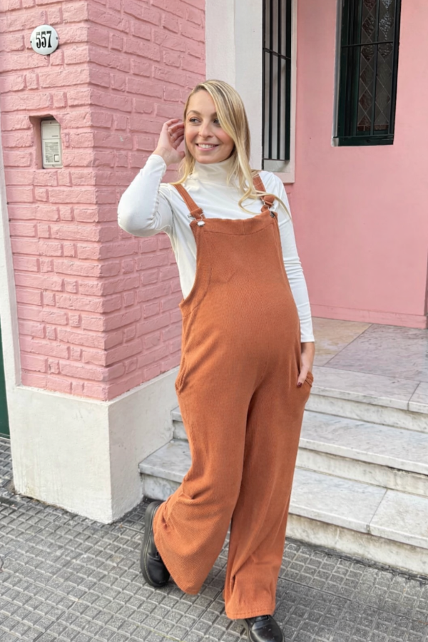 Jardinero en DARLON Brush, con broches regulables y desmontables. La tela parece un corderoy, pero más fino, y súper elastizado, cómodo como una calza. Se adapta a todos los cambios de tu cuerpo.