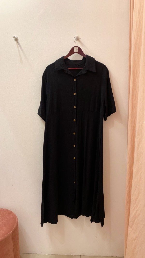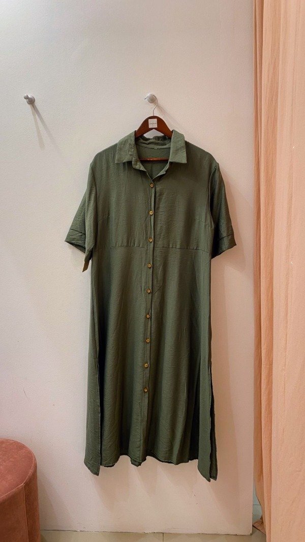 Vestido camisero de cey quebrado (no necesita plancha) con tajos en los laterales.